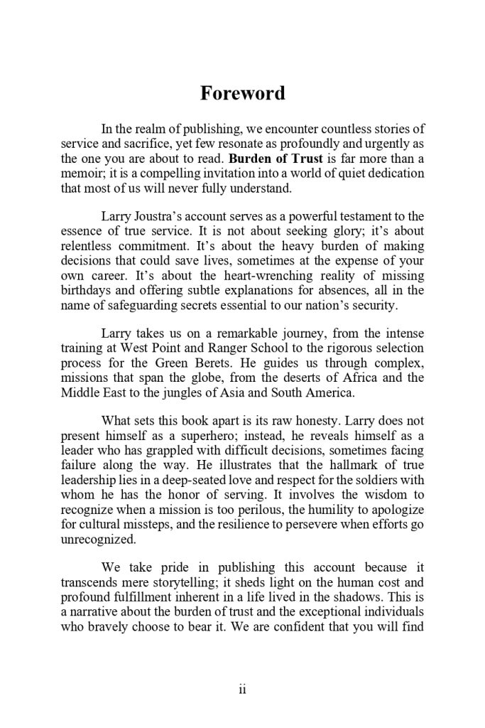 Burden of Trust takes you inside the hidden world of national security, where secrecy and loyalty carry unimaginable weight. With firsthand insight and gripping detail, Lawrence Joustra reveals the challenges, sacrifices, and moral dilemmas faced by those sworn to protect America’s most sensitive secrets.